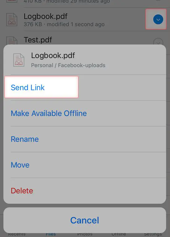 Drücke den Kreis mit dem kleinen Pfeil nach unten neben dem Logbuch und wähle "Sende Link" aus.