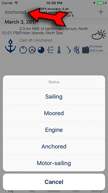 Status) using the button at the top left. This can be, Moored, Anchored, Motoring or Sailing. It is important to always keep this status up to date, as this value is used to calculate the statistics for the trip. So every time you change from one status to another, be sure to update the Status in the app. Each status change in the app automatically creates the corresponding logbook entry. This one task is the only thing you need to keep up to date during your trip in order to have a meaningful logbook at the end.